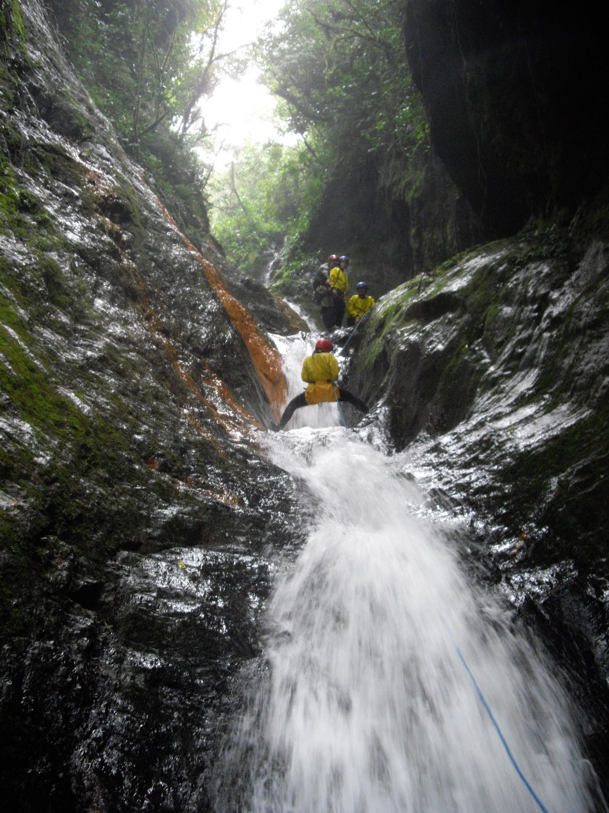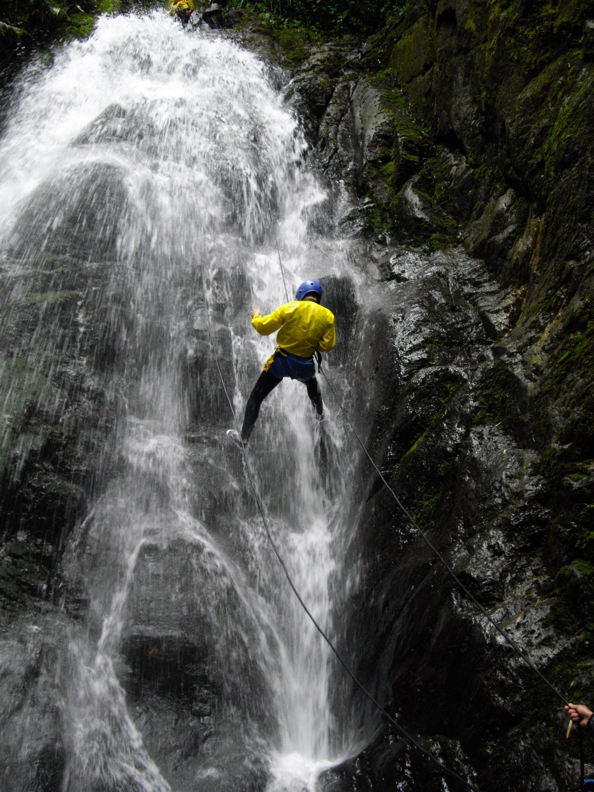 No Equador, esta actividade, em conjunto com muitas outras, permite o desenvolvimento de áreas remotas levando ao dinamismo de povoações pouco acessíveis. No Parque Nacional de Llanganales, próximo de Rio Branco, experimentamos o prazer das descidas em cascatas! A Geotours, em Baños, foi a empresa que escolhemos para nos “orientar” nesta aventura. Ainda bem que o fizemos porque é muito competente e o equipamento é muito bom. Os guias são fabulosos, atenciosos e muito técnicos. Éramos sete pessoas, dois portugueses e cinco alemães. Começamos por experimentar o equipamento e a técnica de descida em rappel numa queda com 6 metros. Depois fomos descendo o canhão em quedas cada vez maiores, desde 8, 15, 20 e a última com 35 metros. Foi o MÁXIMO!