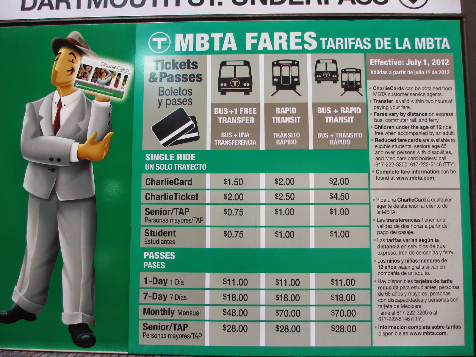 Metro: Pode-se adquirir os passes diários (11USD) ou passes semanais (18USD). Os bilhetes individuais custam 2.5USD. No entanto, existe também a opção de comprar o Charlie Card (10.50USD – cartão de papel pré-pago para múltiplos usos com tarifa promocional) sendo que com esse cartão cada viagem fica por 2USD. As máquinas aceitam cartões de crédito.