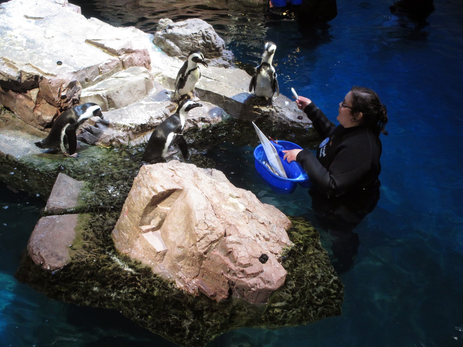 Na base do tanque gigante existe uma área que alberga mais de 80 pinguins, sendo a maioria pinguins-africanos, uma espécie bastante ameaçada. Há também pequenos pinguins-azuis, a espécie mais pequena do mundo e originária da Oceânia. Mas, as verdadeiras estrelas da companhia são os pinguins rockhoppers (pinguins com cristas) com uma ar gozão e descontraído. Até pareciam que estavam com vontade de se sentarem numa esplanada e beber um copo. Achei-os o máximo.