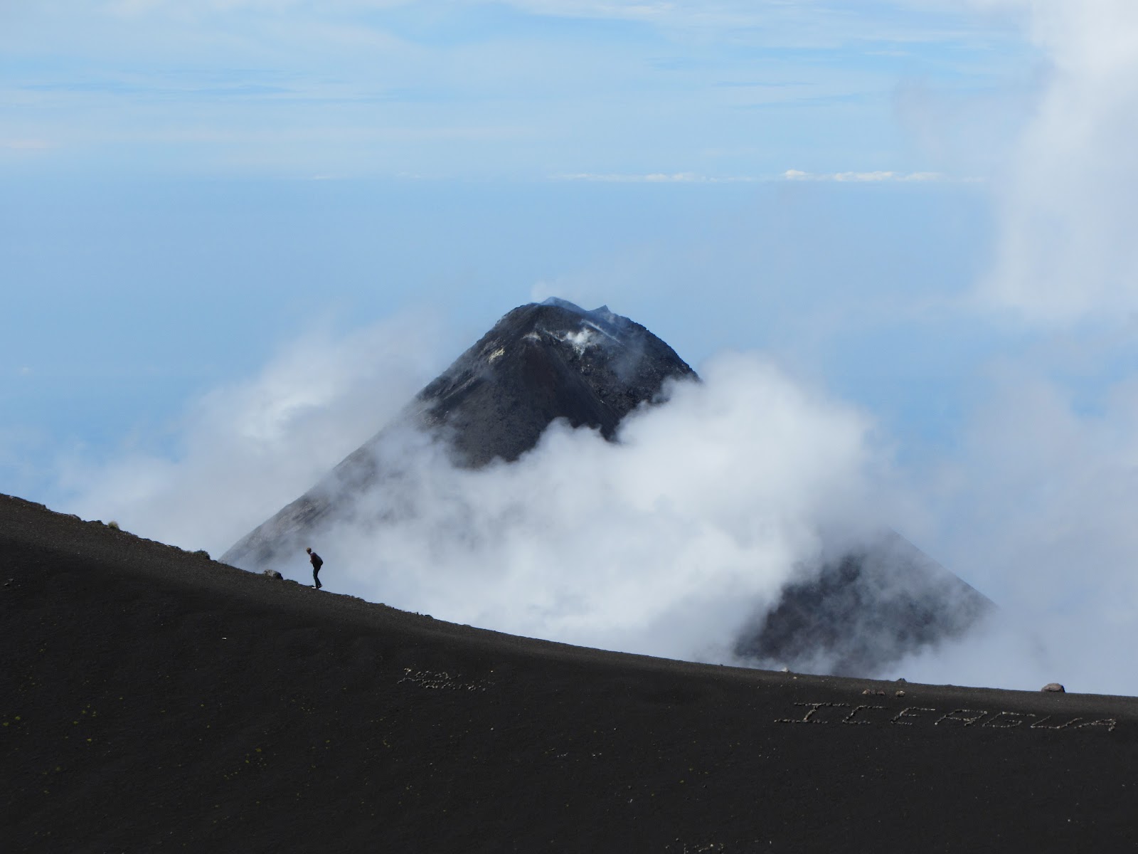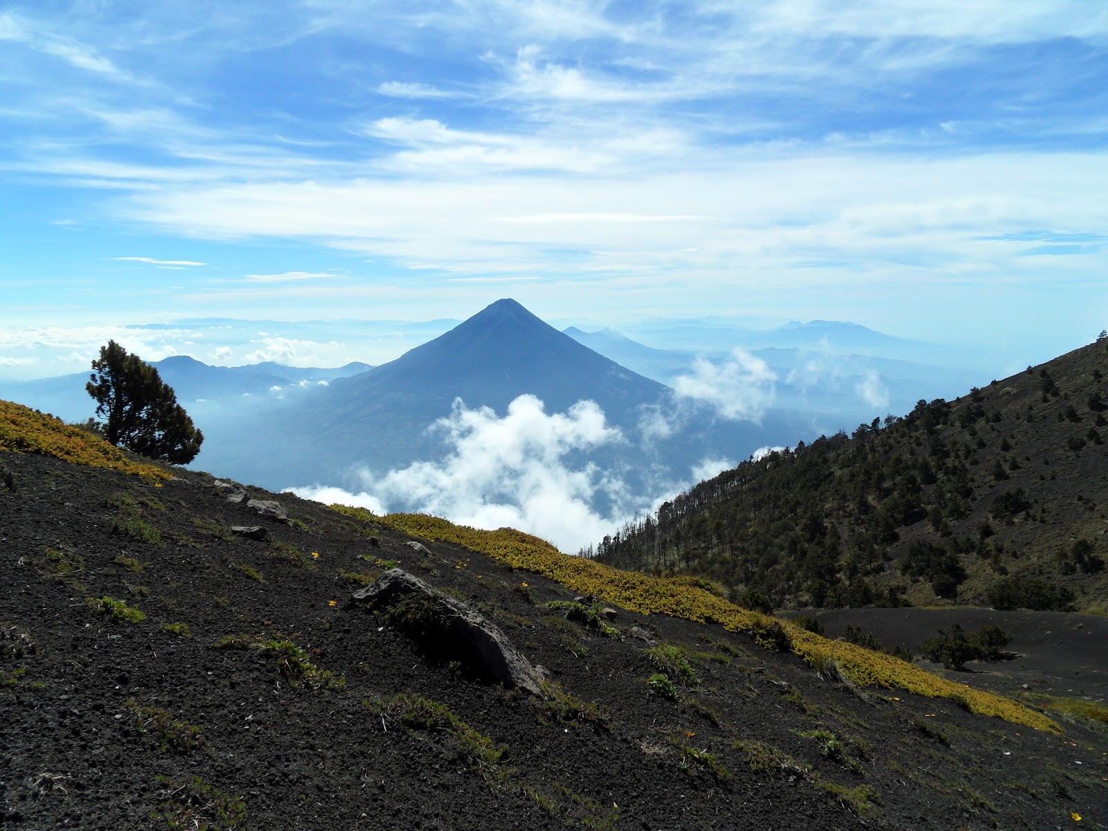 Só quando estamos quase a chegar ao primeiro cume, a 3880 m, é que alcançamos a Carla. O guia e os rapazes passam para a frente; eu e a Carla seguimos atrás. A paisagem é puramente vulcânica. O céu está pouco nublado, quase limpo. O sol brilha. Do primeiro cume, tem-se uma vista espectacular para o cume mais alto e as diversas (agora inactivas) crateras do vulcão, assim como em redor. Mas ainda não se avista o Fuego, por trás deste cume. A oriente, avista-se o majestoso vulcão Água e a cidade de Antigua e, a ocidente, os vários vulcões do lago Atitlán. Muito ao fundo, ainda se consegue notar os vulcões Santa Maria e Tajumulco. Depois de descansarmos, e de tirarmos fotos à paisagem, temos de continuar. Temos de descer um pouco, antes de iniciar a subida final. O desnível a subir será talvez de 150 a 200 m, mas parece bastante inclinado.