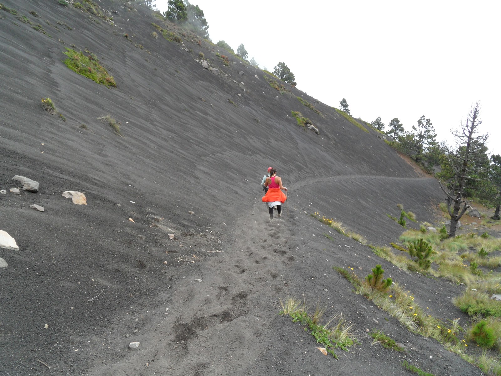 Nos Alpes ou nos Pirenéus, uma montanha com a altura do Acatenango estaria coberta de neve, gelo e possivelmente glaciares. Porém, a esta latitude, e à decorrente incidência solar e elevada humidade do ar, as montanhas apresentam vegetação até aproximadamente 4000 m de altitude. E tem de se subir até aos 4500 m para se começar a ver neve… A terra é negra, carregada de minerais expelidos por erupções anteriores do Acatenango e do seu vizinho, e excelente para a agricultura. Assim, nas primeiras centenas de metros de subida, a paisagem é dominada por campos cultivados, ao lado dos quais caminhamos.