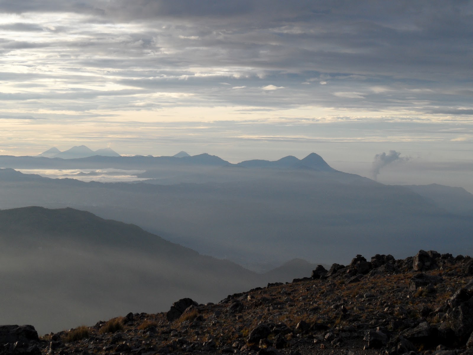 No dia seguinte, acordamos às 4.30 com o Luís a dizer que o tempo estava lindo! Vestimo-nos e iniciamos a subida depois de comermos um chocolate (o pequeno-almoço ficaria para depois da descida). Conforme subíamos a parte rochosa do vulcão, a alvorada ia dando ares da sua graça. O nascer-do-sol visto do topo da América Central é LINDO! Toda a cadeia vulcânica da Guatemala era visível no horizonte, assim como as luzes da ainda adormecida cidade de Xela (Quetzaltenango). Podíamos notar ao fundo o fumo que saía do vulcão Santiaguito.