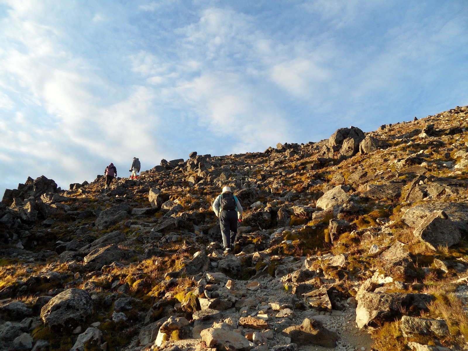 O terreno é um pouco inclinado, mas às zonas mais difíceis sucede sempre terreno mais plano. E, afinal de contas, pode-se sempre descansar regularmente! O que não pudemos fazer, foi apreciar a paisagem, pois a montanha encontrava-se debaixo de uma neblina algo cerrada. Estávamos apreensivos quanto ao que poderíamos ver no cume…