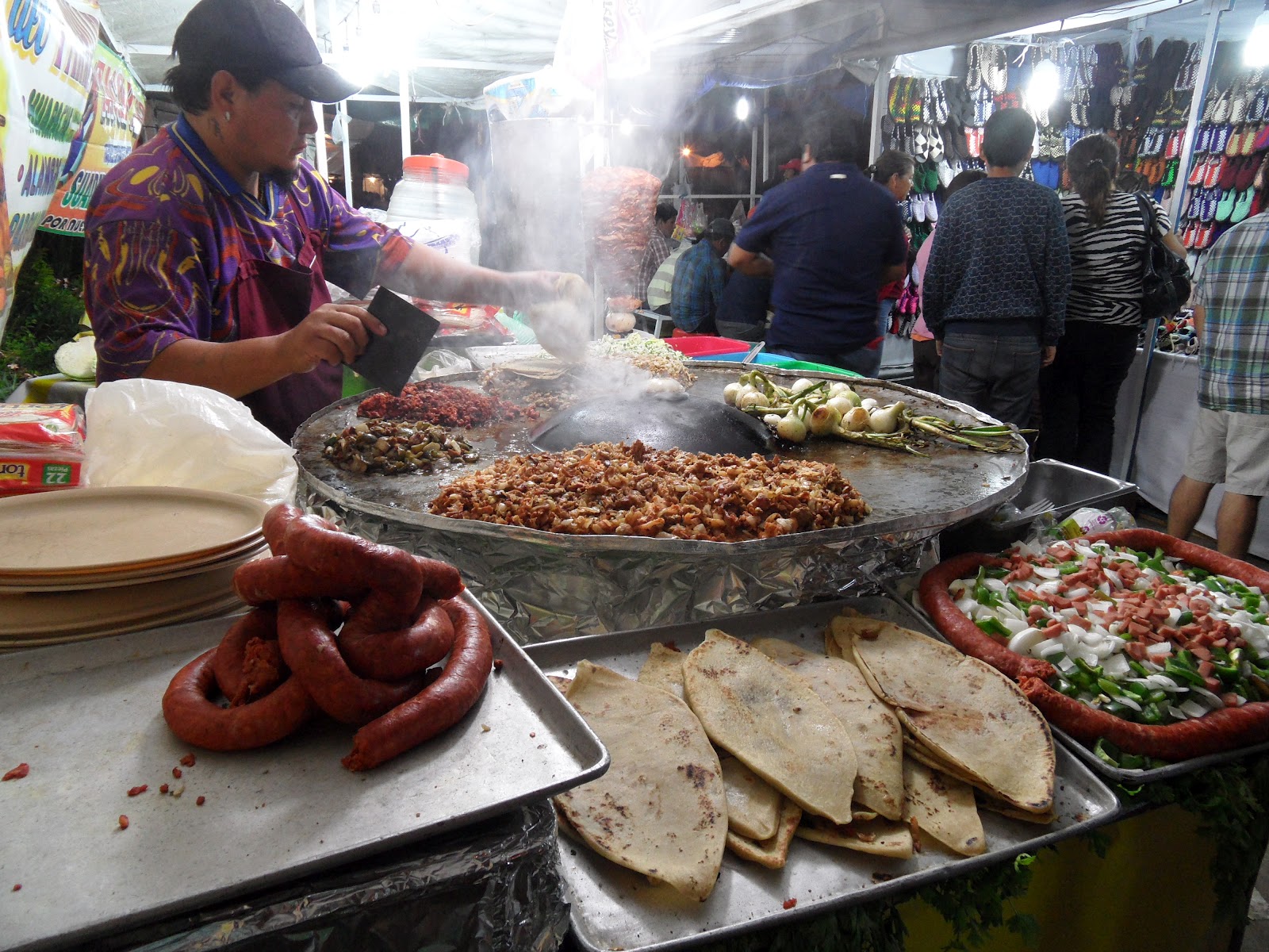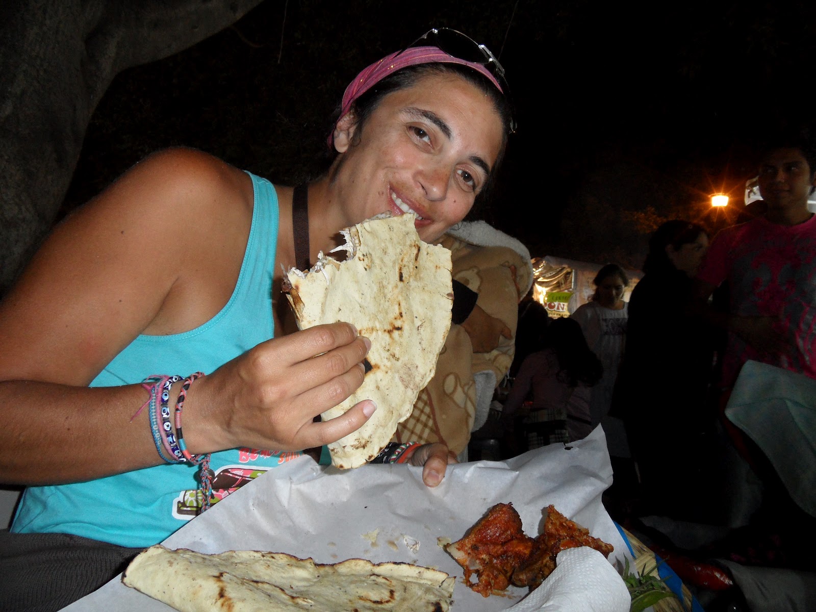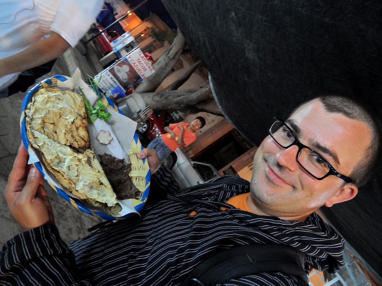 O nosso faro astuto rapidamente nos levou para uma banca de “tlayudas”, um prato típico local que consiste numa espécie de tortilha grelhada na brasa recheada com queijo, frijoles (feijões moídos) e legumes acompanhada por “costilla” (dois nacos de carne). Nada mau para começar a nossa passagem pela cidade e pelo Guelaguetza. O Mezkal, achamos melhor deixar para os próximos dias. Estávamos cansados e decidimos deitar-nos cedo.